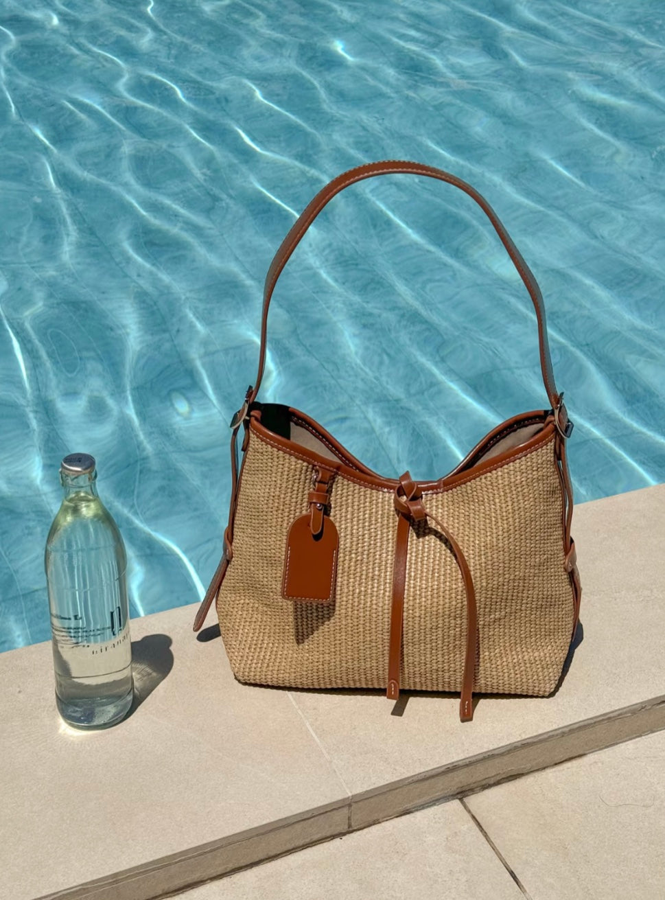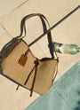 ✨ A finely textured straw body complemented by warm tan leather accents