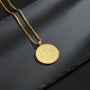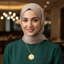 This gold round medallion necklace blends spiritual devotion with timeless elegance. The polished gold-tone pendant is engraved with the Arabic calligraphy of “Allah,” symbolizing faith and strength. Paired with a durable woven chain, this piece is perfect for those who appreciate meaningful jewelry with a luxurious touch.