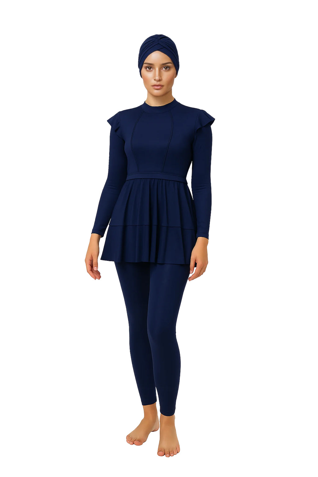 Rania Modest Burkini 3-Piece Full Coverage Swim Set – Navy Tiered Ruffle