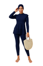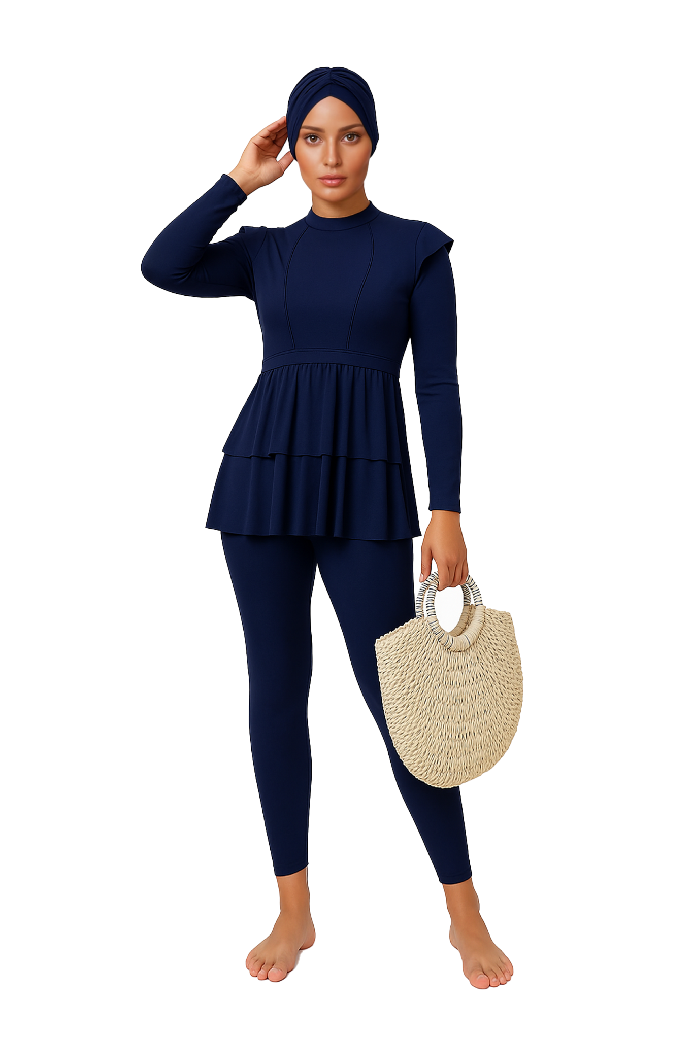 Make a stylish splash this season with the Rania Burkini, a three-piece swim set designed for confident, modest movement. This romantic tiered ruffle navy set features: