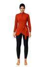 Command the shoreline in the Maya Burkini, a bold fusion of warm rust and sleek black. Designed for stylish movement and confident coverage.