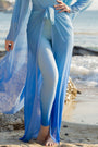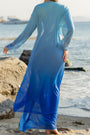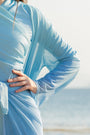 Channel coastal calm in the Maya Burkini with a flowing sky-blue cape overlay. Perfect for gliding between poolside and seaside with effortless grace.