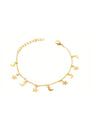 A playful gold-tone bracelet adorned with alternating crescent moon and star charms. Its lightweight chain and adjustable clasp make it a versatile piece for layering or solo wear.