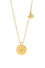 Inspired by celestial beauty, this gold-tone necklace features a round medallion engraved with a radiant starburst and accented with a tiny crystal at its center. An additional star charm adds dimension and whimsy to the chain. This piece captures the essence of guidance, hope, and inner light—making it an elegant statement on its own or layered with others.