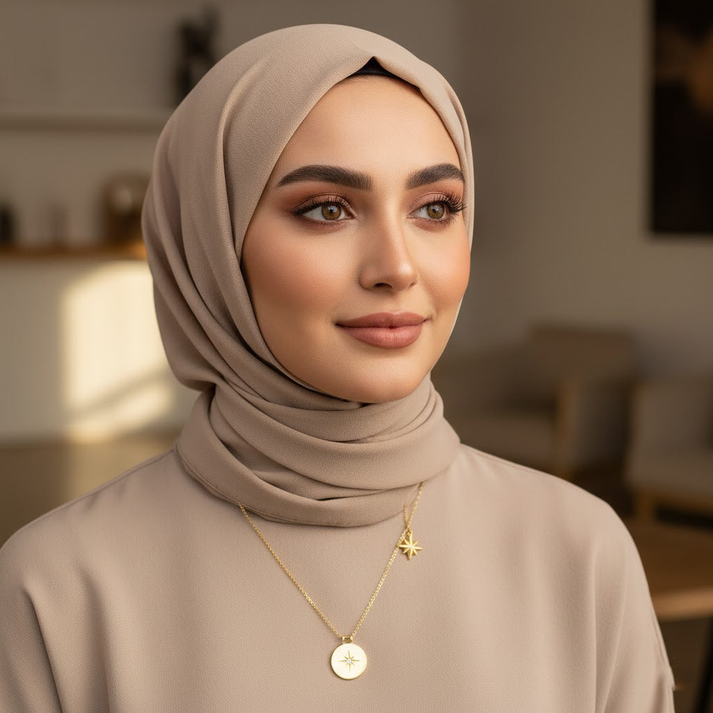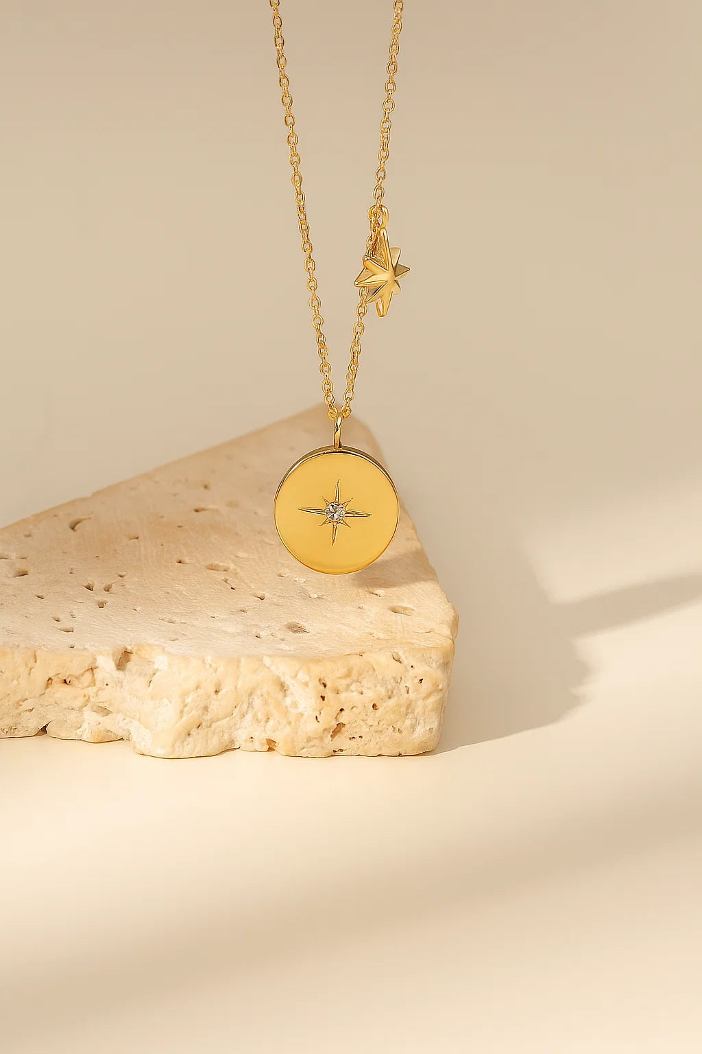 🌟 Round medallion pendant with compass star engraving and crystal detail
