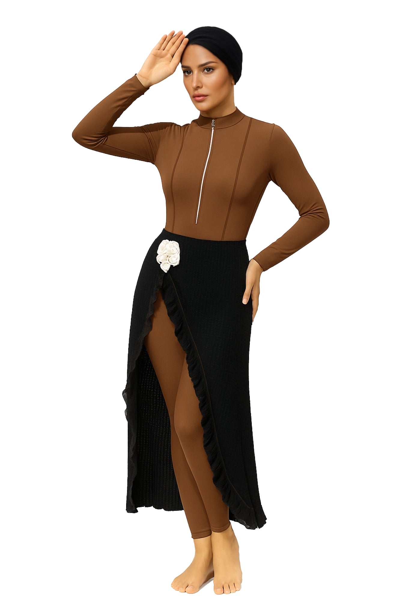Yasmin Modest Burkini 3-Piece Full Coverage Swim Set - Cocoa Brown & Black