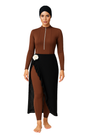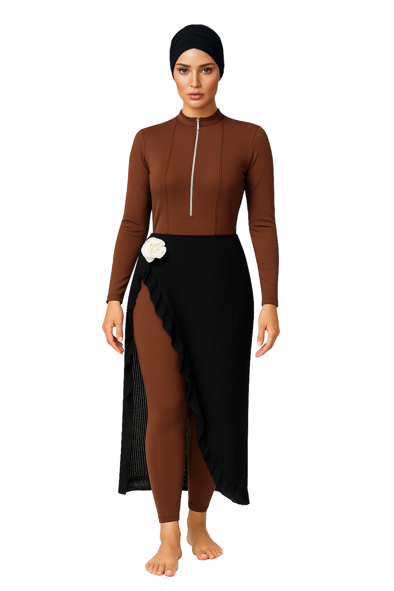 Make a stylish splash this season with the Hawariya Burkini, a three-piece swim set designed for confident, modest movement. This cocoa-brown and black set features: